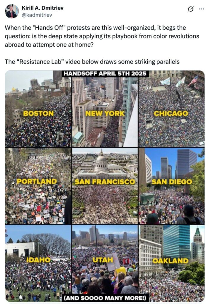 „Когато протестите Hands Off са толкова добре организирани, възниква въпросът: дали дълбоката държава използва своята книга за цветна революция в чужбина, за да се опита да създаде нещо подобно у дома?“