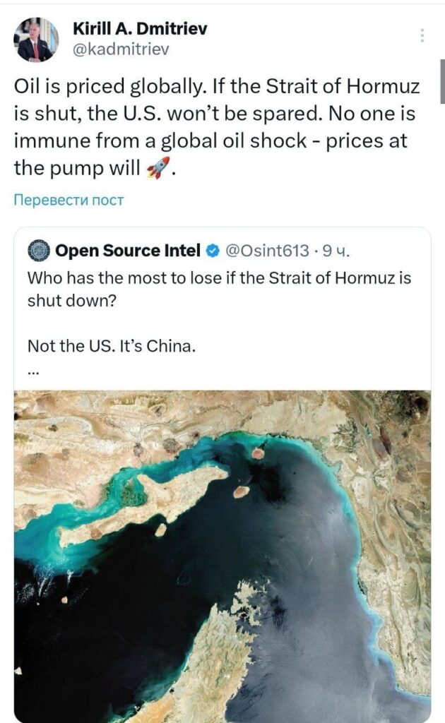 Затварянето на Ормузкия проток ще доведе до „глобален петролен шок“, заяви ръководителят на Руския фонд за преки инвестиции, специален представител на руския президент за инвестициите и икономическото сътрудничество Кирил Дмитриев.