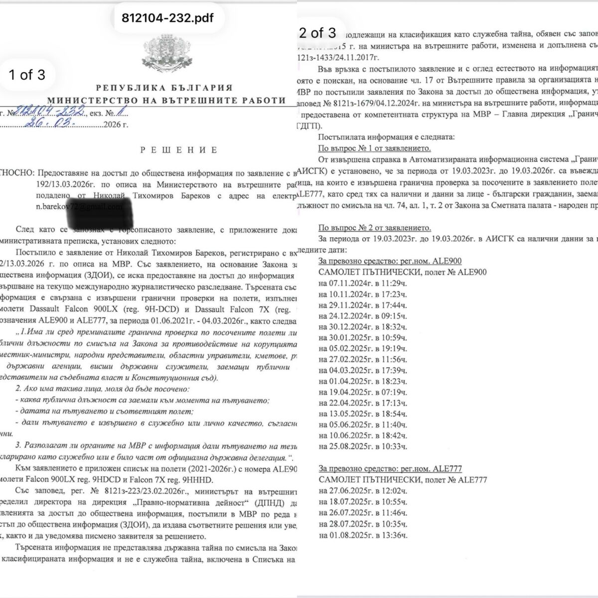 МВР отговори на запитването на журналиста от BNEWS и бивш евродепутат и заместник председател на Европейските Консерватори и Реформисти Николай Бареков дали лице на публична длъжност е летяло с частните самолети FALCON, известни като “Фалконите на Пеевски”, през последните 3 години от Летище София.