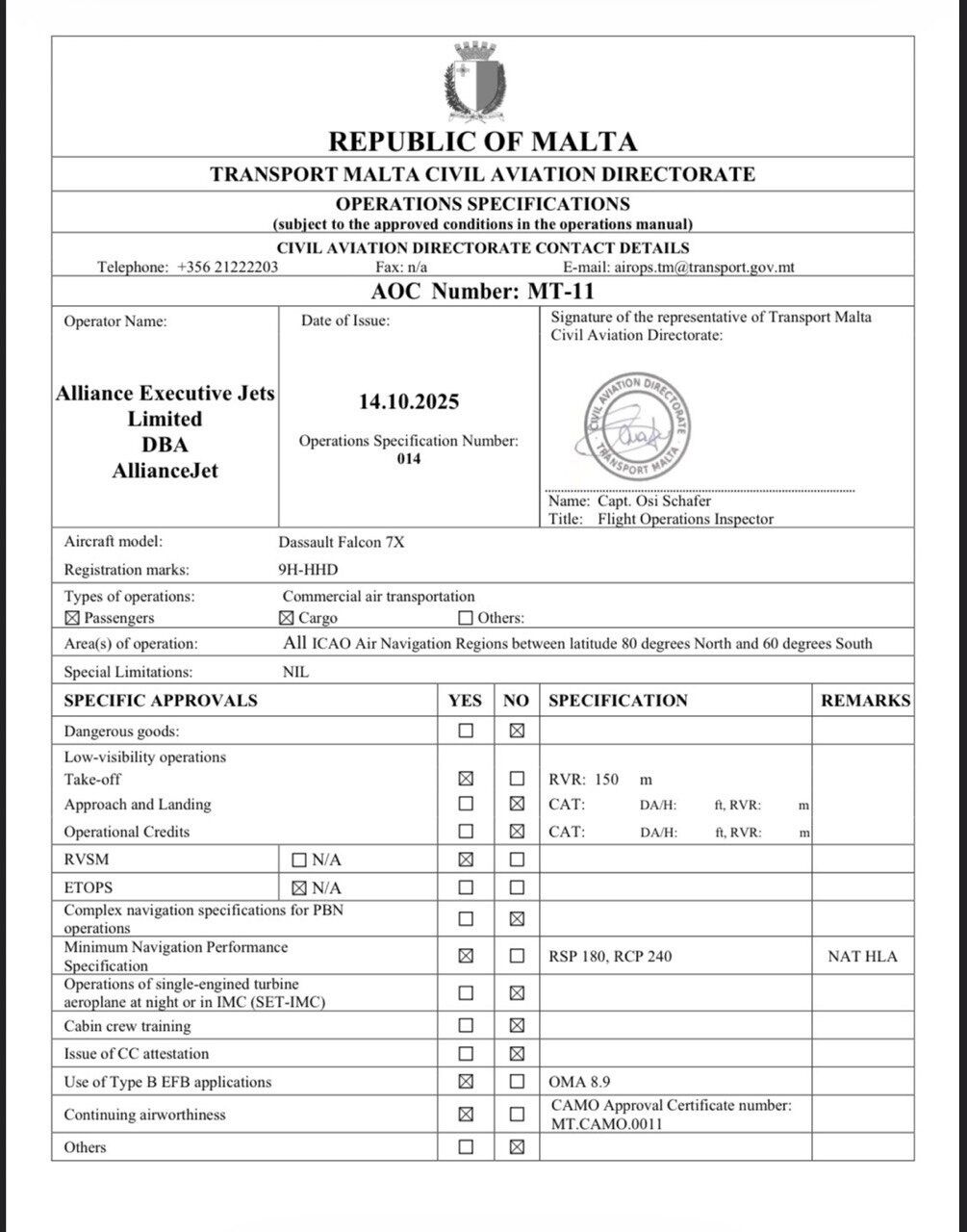 самолети Dassault Falcon 900LX (reg. 9H-DCD) и Dassault Falcon 7X (reg. 9H-HHD), c