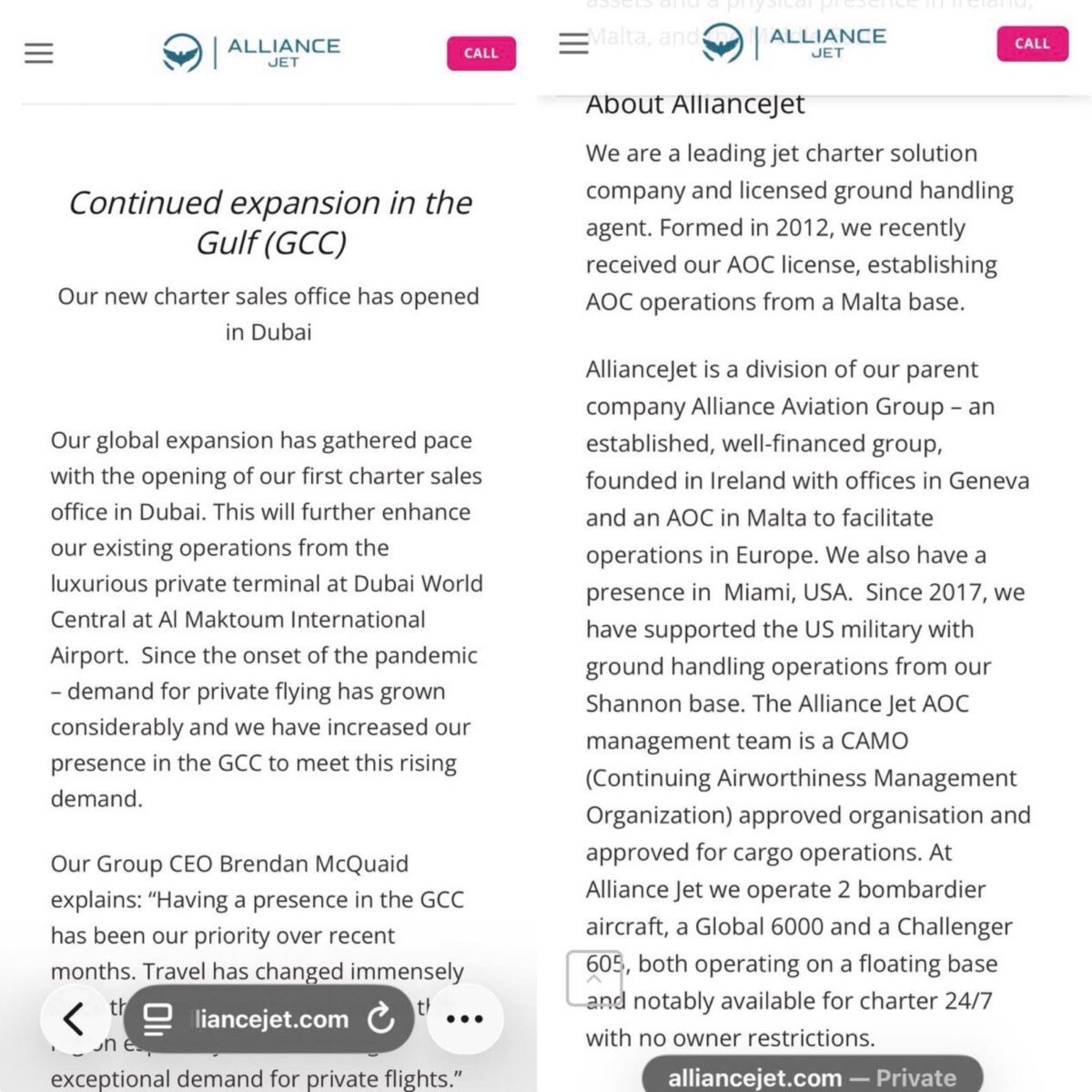 В своя прес съобщение и официална брошура, AllianceJet (част от Alliance Aviation Group) директно посочва:
