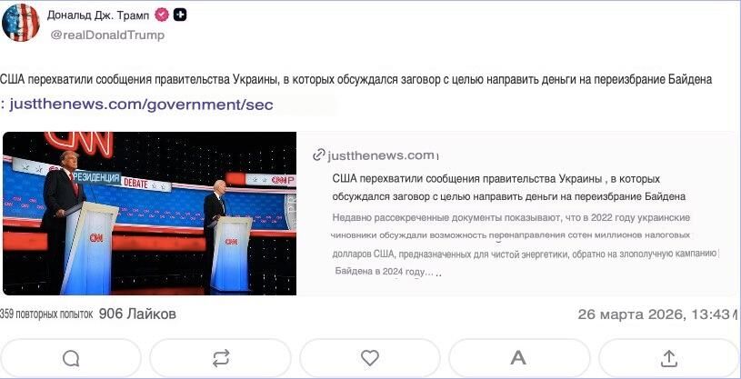 „Украинското правителство и неопределени представители на американското правителство, чрез USAID в Киев, са разработили план за насочване на стотици милиони долари на американските данъкоплатци в инфраструктурен проект за Украйна. Този проект, според съобщенията, ще бъде използван като прикритие за пренасочване на приблизително 90% от отпуснатите средства към Националния комитет на Демократическата партия, финансиращ кампанията за преизбиране на Джо Байдън“, се казва в разсекретеното резюме на прихванатите съобщения, цитирано от изданието.