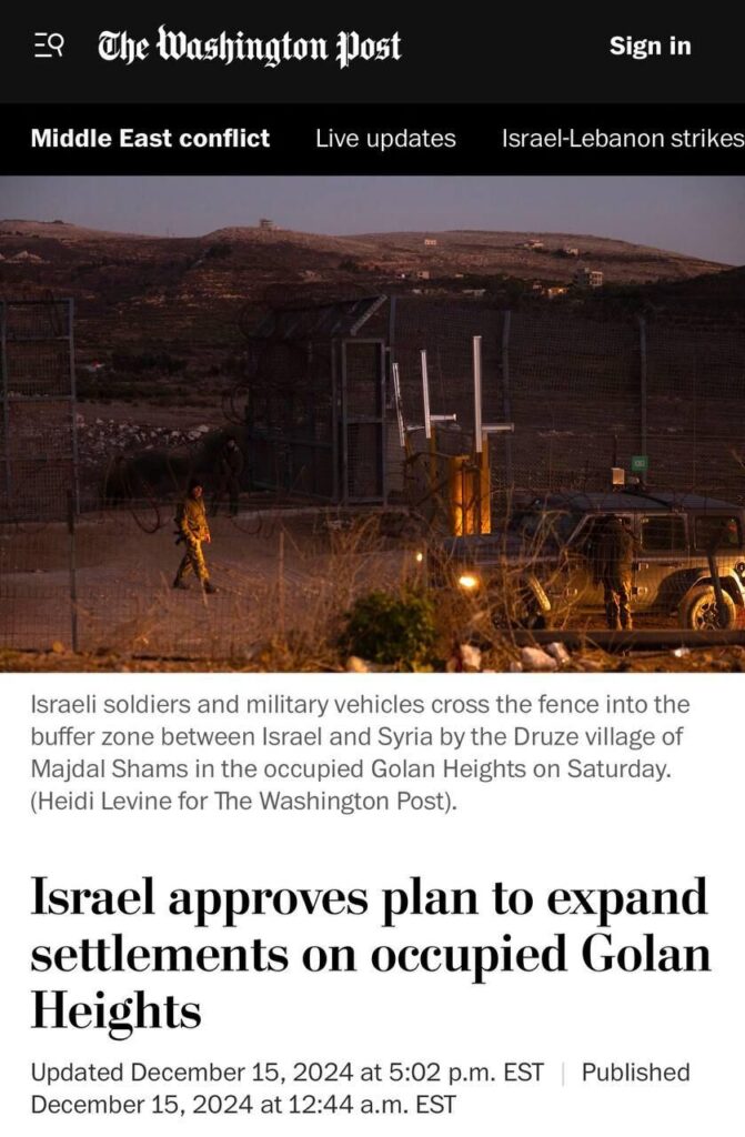 Правителството на Израел одобри в неделя план за разширяване на селищата в окупираните Голански възвишения, заявявайки, че действа „в светлината на войната и новия фронт в Сирия“, докато страната използва вакуума на властта в съседство, за да укрепи сигурността по границата си и да постигне целите си за разширяване на селището.