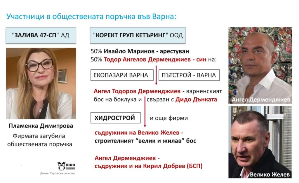 Маринов има дял във фирма, която е спечелила обществената поръчка, от която според Антикорупционната комисия (КПК) Коцев искал процент. Той е съдружник в тази фирма с Тодор Дерменджиев, чийто баща е варненският бос на боклука Ангел Дерменджиев. Ангел е съдружник с Кирил Добрев от БСП и е имал участие в “Хидрострой” на Велико Желев, който купи “Водстрой 98” свързвана със санкционираният за корупция Делян Пеевски от ДПС Ново начало. Освен това Ангел е свързван в публикации в медиите с небезизвестния Дидо Дънката. И Дънката и Киро Добрев от БСП работят активно под шапката на Пеевски.