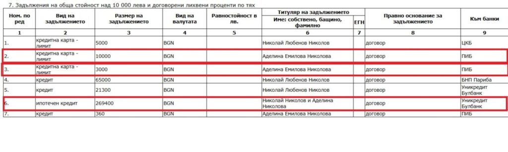 Извлечение от данъчната декларация, която Аделина Николова подава пред Комисията за противодействише на корупцията, доказва тежка банкова задлъжнялост