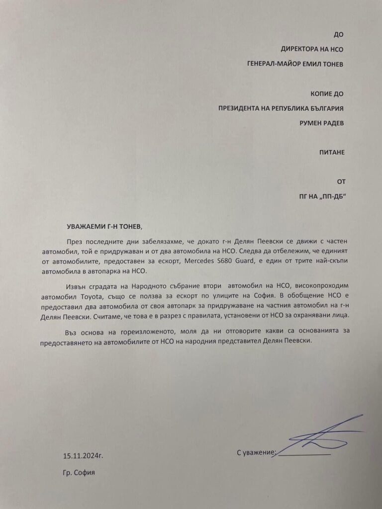 “През последните дни забелязахме, че докато г-н Делян Пеевски се движи с частен автомобил, той е придружаван и от два автомобила на НСО“, пишат в писмо от ПП-ДБ до директора на НСО генерал-майор Емил Тонев, което е изпратено с копие и до президента Румен Радев.