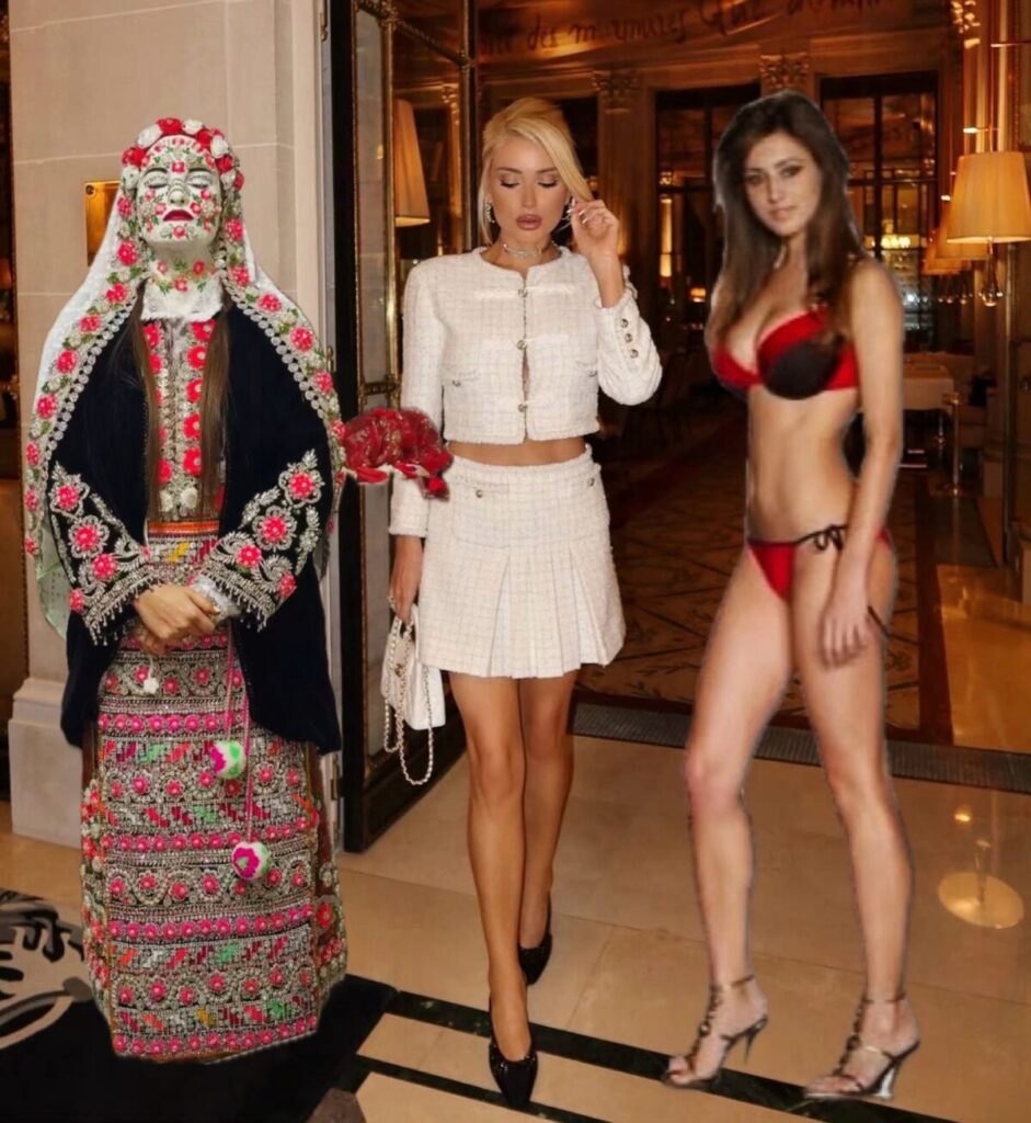 (Колаж: Момиче от Рибново, Цветелина на Пеевски и Мис Бикини с къщата от Барселонагейт на Бойко Борисов.)