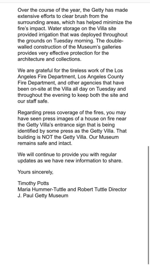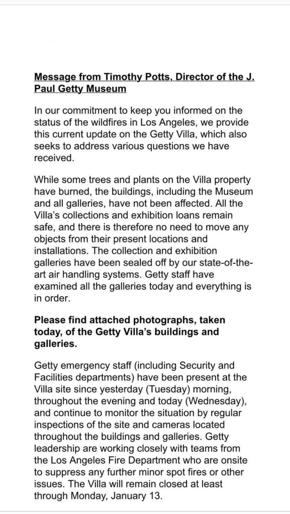 Заради огнения ад в Калифорния, причинен от огромните горски пожари, в Лос Анджелис беше обявено извънредно положение. Наредена е евакуацията на близо 50 хиляди души. Застрашени са десетки хиляди сгради. Сред тях и музеят „Пол Гети“, в който се намира в момента и Панагюрското златно съкровище.