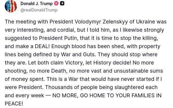 „Срещата ми с украинския президент Володимир Зеленски беше много интересна и сърдечна, но му казах – както преди това настоявах президента Путин – че е време да спрем убийствата и да сключим СДЕЛКА! Стига кръвопролития, стига определяне на граници с война и смелост. Нека спрат там, където са. Нека и двамата се обявят за победители – историята ще съди! Край на изстрелите, край на смъртните случаи, край на огромните и неустойчиви разходи. Тази война никога нямаше да започне, ако бях президент. Хиляди хора биват убивани всяка седмица – СТОЙНО, ВЪРНЕТЕ СЕ У ДОМА ПРИ СЕМЕЙСТВАТА СИ С МИР!“