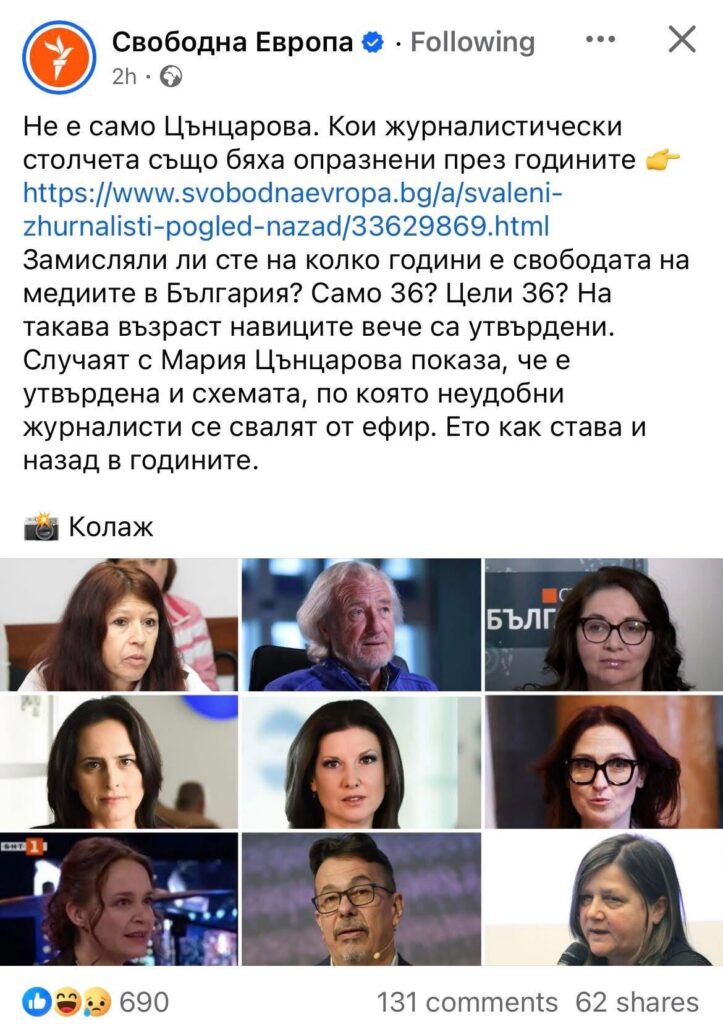 Връх на либералния цинизъм и липса на емпатия към колегите и различните по идеологически признак, които не сме на хранилката на правилното НПО! Колеги от Free Europe, къде сме в този списък още десетки други уволнени от БТВ, Нова и БНТ неудобни журналисти, много по-знакови от тези долу, а някои и вече покойници – Милен Цветков, Жоро Коритаров, моя милост, Диляна Гайтанджиева, Карбовски, Явор Дачков, Сашо Диков и т.н.?