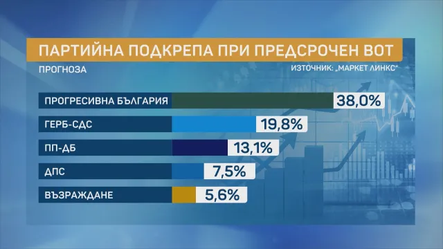 „Половината от колебаещите се отиват директно към „Прогресивна България“ и те печелят с 38%. ГЕРБ-СДС получават 19,8%, ПП-ДБ – 13,1%, „ДПС-Ново начало“ – 7,5% и „Възраждане“ – 5,6%“, обясни социологът.