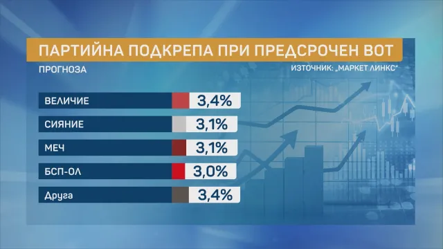 Под 4-процентната бариера остават „Величие“ с 3,1%, „Сияние“ с 2,3%, МЕЧ с 2% и „БСП – Обединена левица“ с 2%.