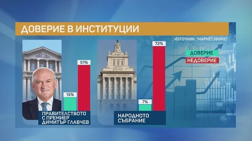 „Маркет линкс“ е измерила и одобрението към кабинета „Главчев“. Ползва се с едва 15 на сто одобрение срещу 51% неодобрение.