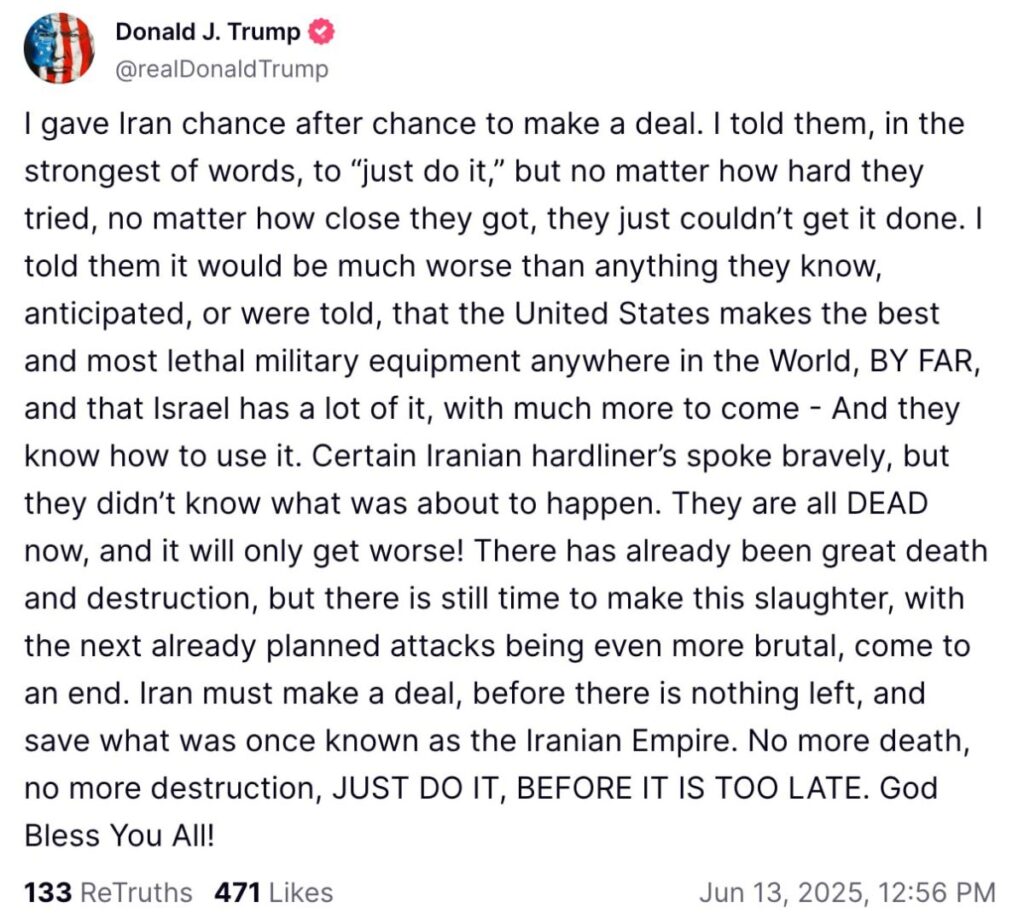 „Дадох на Иран шанс след шанс да сключи сделка. Казах им – с най-силните възможни думи: „Просто го направете.“ Но колкото и да се опитваха, колкото и близо да бяха до сделка – никога не я получиха. Предупредих ги, че последствията ще бъдат далеч по-лоши от всичко, което знаеха, очакваха или им беше казано. Че Съединените щати произвеждат най-добрата и най-смъртоносна военна техника в света – безспорно. А Израел имаше много от нея – и щеше да получи още повече. И, което е важно, те знаеха как да я използват. Някои ирански радикали говориха смело, но не знаеха какво предстои. Сега всички са МЪРТВИ. И ще става само по-лошо. Това вече доведе до големи загуби на човешки живот и разрушения. Но не е твърде късно да се спре тази касапница. Следващите планирани удари ще бъдат още по-брутални. Иран трябва да сключи сделка – преди да е останало нищо от него. Преди това, което някога се наричаше Иранска империя, да изчезне. Край на смъртта. Край на разрушенията. Просто го направете, преди да е станало твърде късно. Бог да ви благослови!”