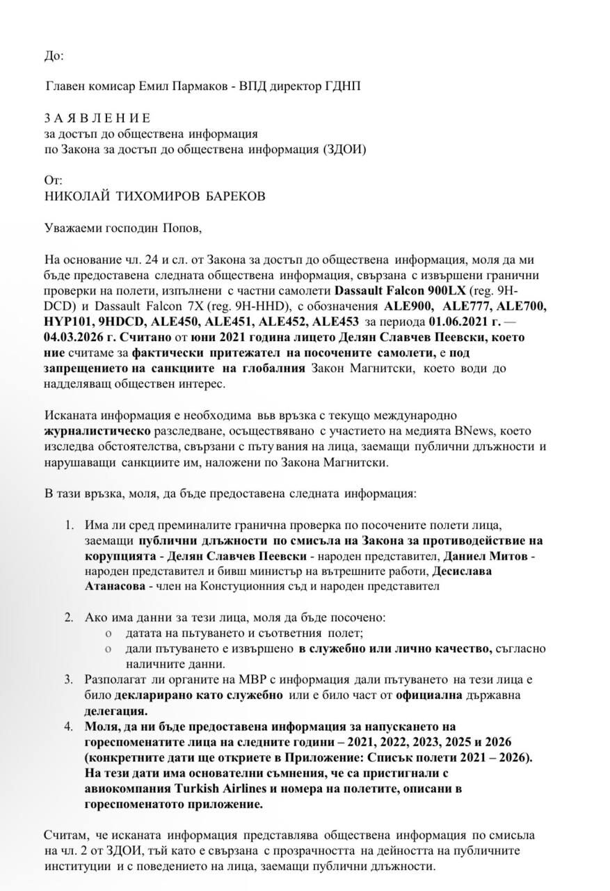 В списъка с приложенията на полетите с Фалконите до МВР от 2021 до 2026 година ние от BNEWS.BG нямаме нито един полет на Тюркиш еърлайнс, но във въпроса към МВР присъства хипотезата, че лицата Делян Пеевски и Десислава Атанасова може да са ползвали турската авиокомпания, за да стигнат до Турция, където двата Фалкона на Пеевски обичайно стоят на паркинг.