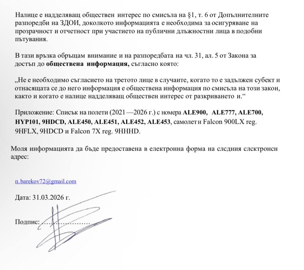 На 99% полетите доказват, че Десислава Атанасова е летяла с Фалкона на Пеевски до Дубай от Истанбул на рождения си ден на 8 октомври и после е летяла наобратно на 10.10. към Истанбул от Дубай. Нека докаже обратното или да подаде оставка, ако този полет не е деклариран пред КПК. Такъв полет струва около 150 000 €. Ние ще сезираме Прокуратурата, Парламента и Конституционния съд за него. Трябва да бъде изискана справка от ОАЕ – Дубай: влизала ли е Атанасова в страната им на 8.10 .2023 година. Това може да направи МВР и Прокуратурата по линия на международното сътрудничество.