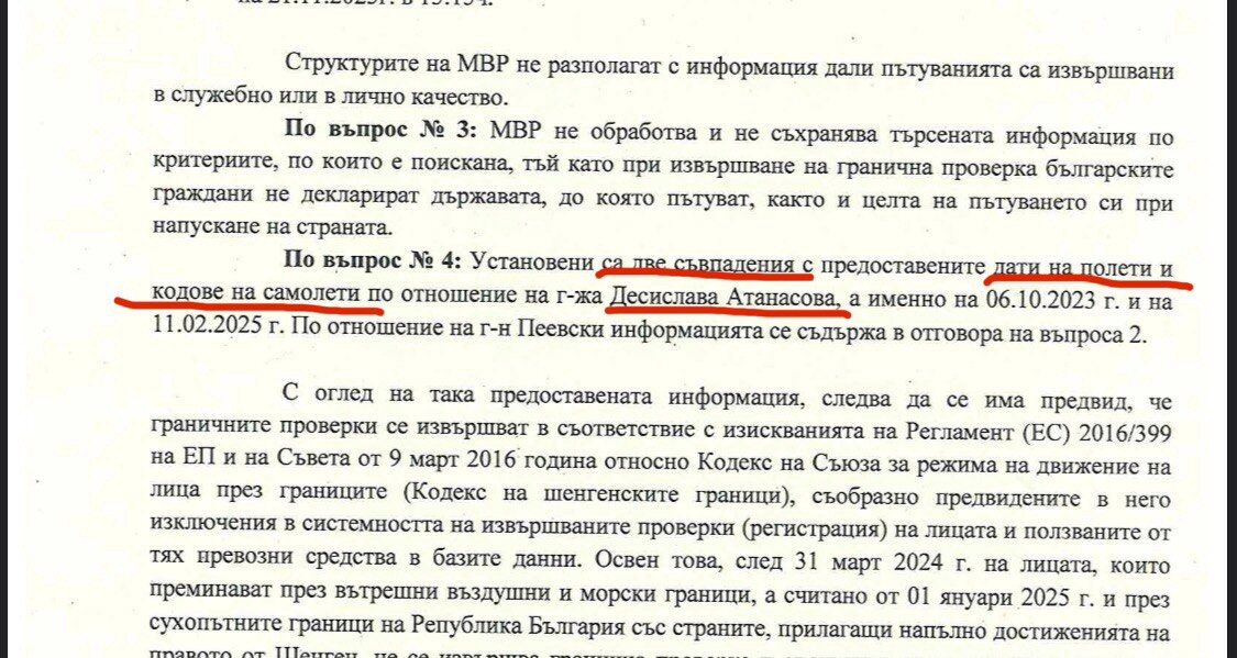 Допълнително МВР ни дава и две дати на излизане на Десислава Атанасова от България в посока Турция, които съвпадат с полетите (и кодовете) на Фалконите на Пеевски и на самия Пеевски. Какво точно ни казва МВР, не става много ясно, защото сигурно такава им е била и целта.