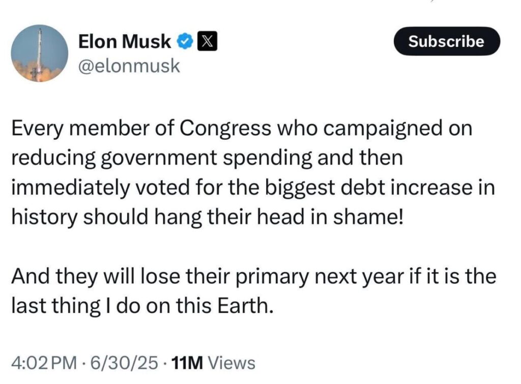 Вчера Мъск засили критиките си, заявявайки, че представителите в Конгреса, които са водили кампания за намаляване на разходите, но са подкрепили законопроекта, „трябва да се засрамят!“, като допълни, че ще загубят „междинните избори в САЩ (за Конгрес) догодина“, ако подкрепят предложеното от Тръмп законодателство.