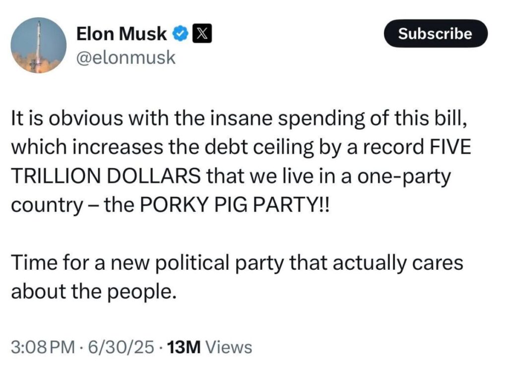 Главният изпълнителен директор на „Тесла“ и „СпейсЕкс“( SpaceX) отново призова за нова политическа партия, заявявайки, че огромните разходи, заложени в законопроекта, показват, „че живеем в еднопартийна страна“. Той направо я определи като еднопартийна система с една голяма свинска партия.