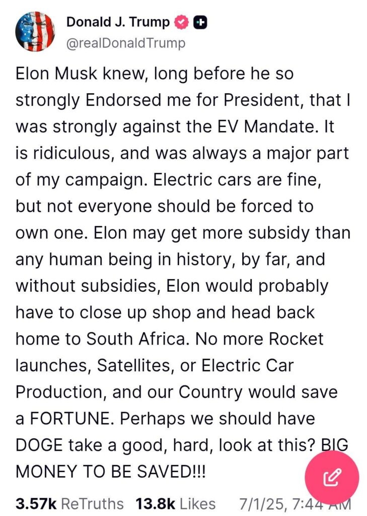 „Илон може да получи повече субсидии от всеки друг човек в историята, далеч, и без субсидии Илон вероятно ще трябва да затвори бизнеса си и да се върне у дома в Южна Африка. Край на изстрелванията на ракети, сателитите или производството на електрически автомобили и нашата страна ще спести цяло състояние. Може би трябва да накараме Департамента за правителствена ефективност да разгледа добре и внимателно това? Големите разходи може да бъдат спестени!!!“, написа Тръмп в публикация в социалната мрежа „Трут соушъл“ (Truth Social).