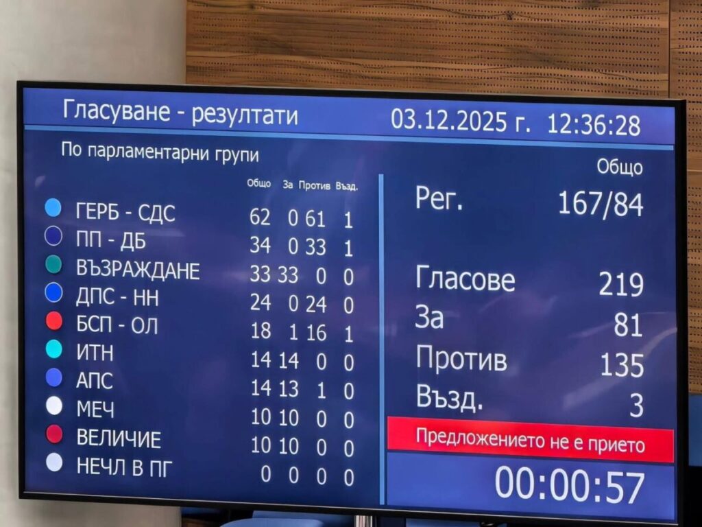 По-рано днес с 81 гласа „за“, 135 „против“ и трима въздържали се парламентът отхвърли предложението на президента Румен Радев за национален референдум с въпрос: „Съгласни ли сте България да въведе европейската валута „евро“ през 2026 година?“. Срещу произвеждането на такова допитване гласуваха от ГЕРБ-СДС, „Продължаваме промяната – Демократична България“, „ДПС – Ново начало“, „БСП – Обединена левица“ и един депутат от „Алианс за права и свободи“.
