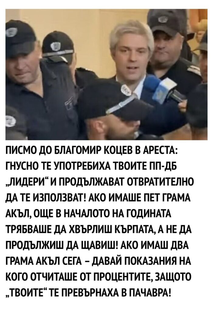 На кого и какво разчиташ сега, Благомире? Пак на тях ли – на партийните си началници в ПП-ДБ, които ОТНОВО ТЕ ИЗПОЛЗВАТ И СЕГА, като на твой гръб се правят на „революционери“, обявявайки те за „политически затворник“, което и ти, и те, знаете прекрасно, че е ДОЛНА ЛЪЖА?