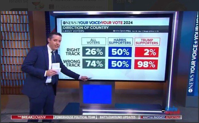 Последните социологически проучвания преди изборите са пълни с необясними аномалии – според ABC NEWS повече от 74% от избирателите смятат, че страната е на грешен път. В същото време 3% повече американци са готови да гласуват за Камала Харис.