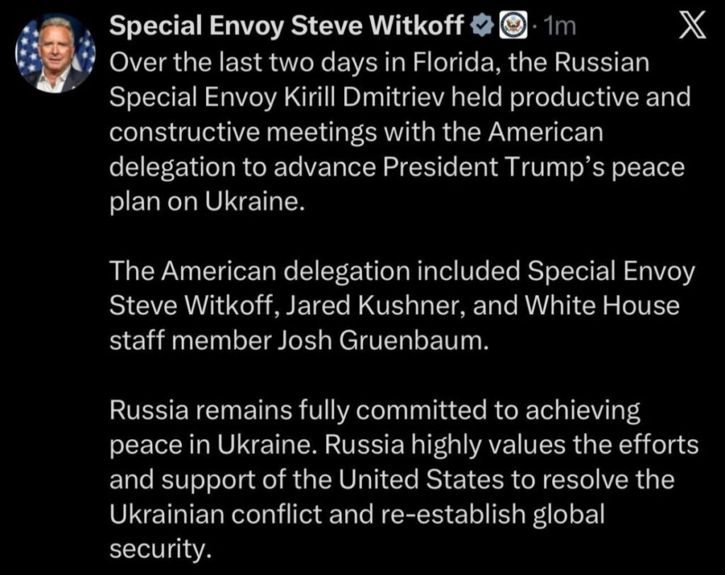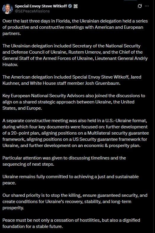 Специалният пратеник на Тръмп Стив Уиткоф публикува изявление след разговори в Маями с участието на делегации от Съединените щати, Европа и Украйна.