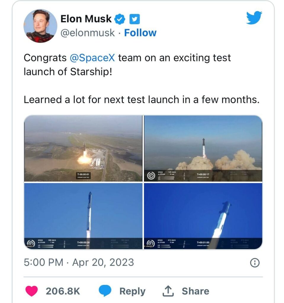 Най-мощната и силна ракета, строена някога на Земята, има задачата да пътува със стотици пасажери до Марс в обозримо бъдеще, но срещна непреодолими технически пречки само 240 секунди, след първия си опит за летене от космодрума в Тексас, САЩ. Няма жертви, а обстоятелствата по катастрофалния инцидент се изясняват в момента. Проблемът и развръзката са настъпили мигновено и без време за реакция на живо по медиите. Полетът на Старшип вече бе отложен един път в понеделник, когато възникнаха проблеми в пет от десетките и двигатели. Един ден ракетата ще лети с гориво, което може да се произвежда и презарежда на Червената планета. Един ден, който се отдалечи фатално във времето след днешния инцидент. Опит за летене, но за жалост повече опит, отколкото летене. Малко след злополучния старт Илон Мъск се поздрави в Туитър с успеха. Засега успех по излитане. Остава да се решат само проблемите с летенето и с кацането, а до Марс полетът би трябвало да продължи няколко години. Самият Мъск предвидливо бе обявил преди време, че първото изстрелване на Старшип крие огромен риск.
