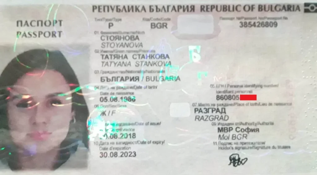 Документът, който виждате на снимката, е закупен от руска гражданка, която живеела с англичанин, но имала проблем да получи виза за Острова. Срещу 2500 евро през 2020 г. българското консулство решило този проблем, разкри източник на BIRD, пожелал анонимност. Паспортът е издаден на името на Татяна Станкова Стоянова от ОДМВР-Разград със задна дата и валидност пет години: 2018 – 2023 г.