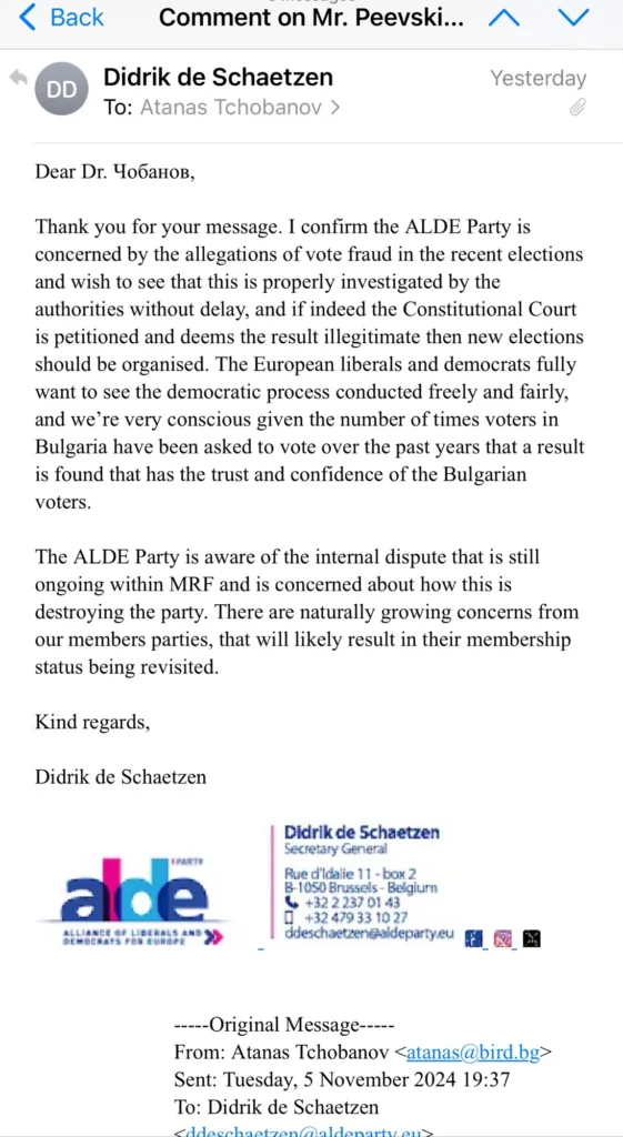 Потвърждавам, че партията ALDE е обезпокоена от твърденията за измами с гласуването на последните избори и желае да види, че това е надлежно разследвано от властите незабавно, и ако наистина Конституционният съд бъде сезиран и счете резултата за нелегитимен, тогава трябва да се проведат нови избори” – пише де Шетцен.