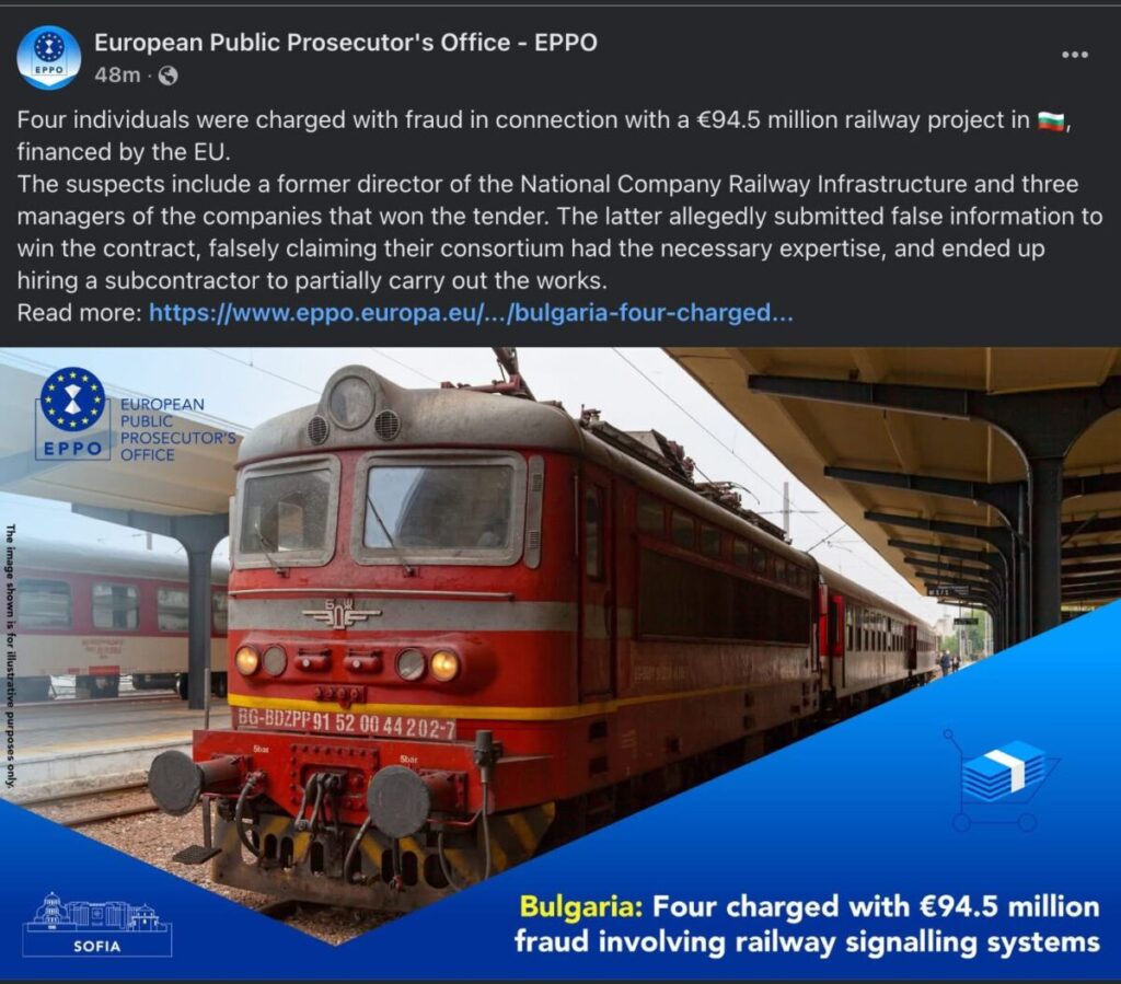 Според съобщението на Европейската прокуратура законните представители на дружествата, формирали консорциума, са представили невярна информация на НКЖИ, за да получат незаконно средства от ЕС.