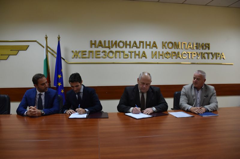 Бившият генерален директор на НКЖИ Красимир Папукчийски и представител на консорциум „Пломбур“ подписват договора за телекомуникации и сигнализация за участък от жп линията Пловдив – Бургас през октомври 2019 г. (Снимка НКЖИ)