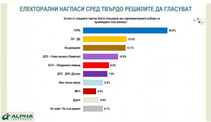 Ако изборите бяха днес, резултатите щяха да изглеждан по следния начин: ГЕРБ-26.0%, ПП-ДБ-13.4%, Възраждане-13.1%, ДПС-Ново начало-10.8%, БСП-8%, АПС-7.5%, ИТН-6.2%, МЕЧ-4%.