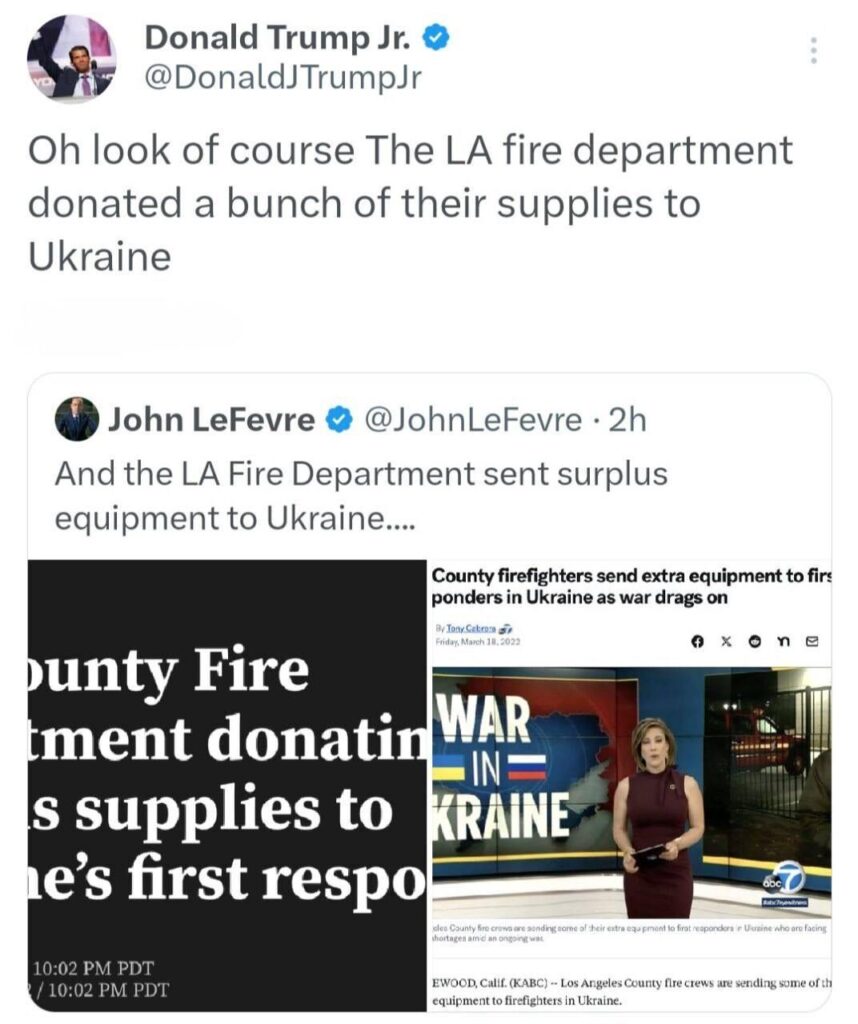 Доналд Тръмп младши свърза сегашните катастрофални пожари в Калифорния с помощта на САЩ за Украйна и обвини политиката на Байдън за тях. Той публикува заглавия в социалните медии, които описват как пожарната служба в Лос Анджелис преди това е дарила оборудване на украинските си колеги за гасене на пожари, започнали след руските въздушни атаки.