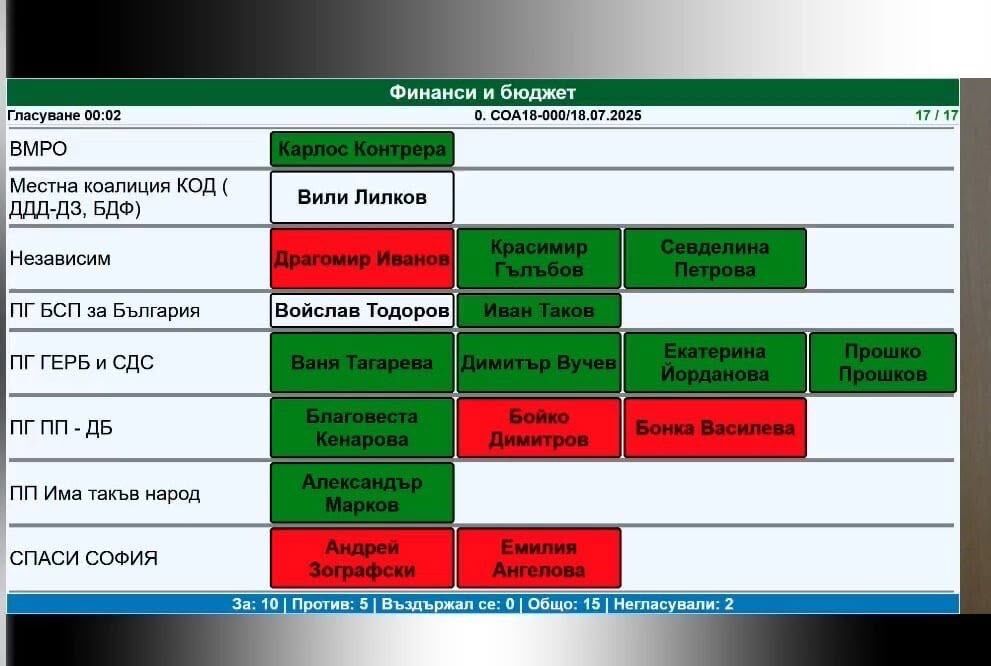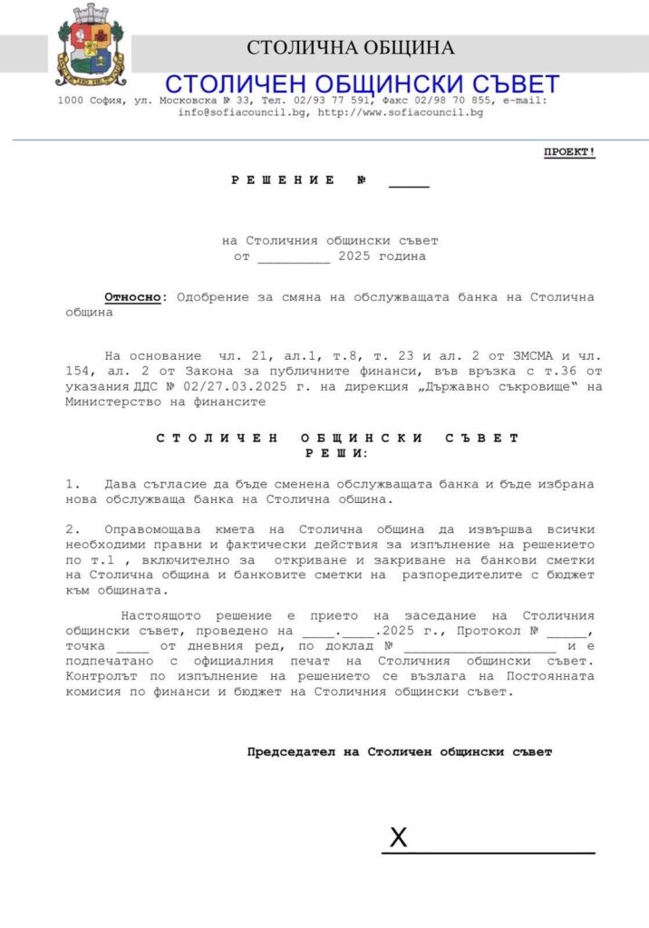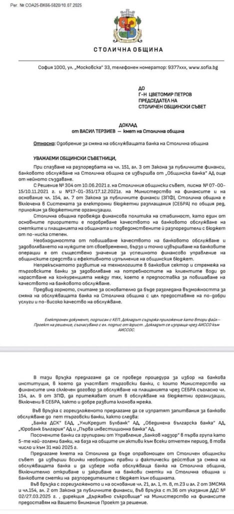 На заседанието на комисията по бюджет и финанси бе включен Доклад № СОА25-ВК66-5820/10.07.25 г. относно смяна на обслужващата банка на Столична община. Поисках отлагането му по няколко причини: