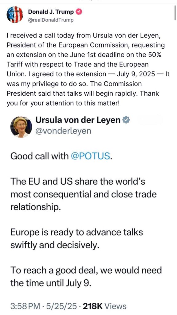 Президентът Тръмп заяви, че удължава крайния срок от 1 юни за 50% търговски мита на ЕС до 9 юли, след като Урсула фон дер Лайен нарече „добър разговор”, който са провели днес.