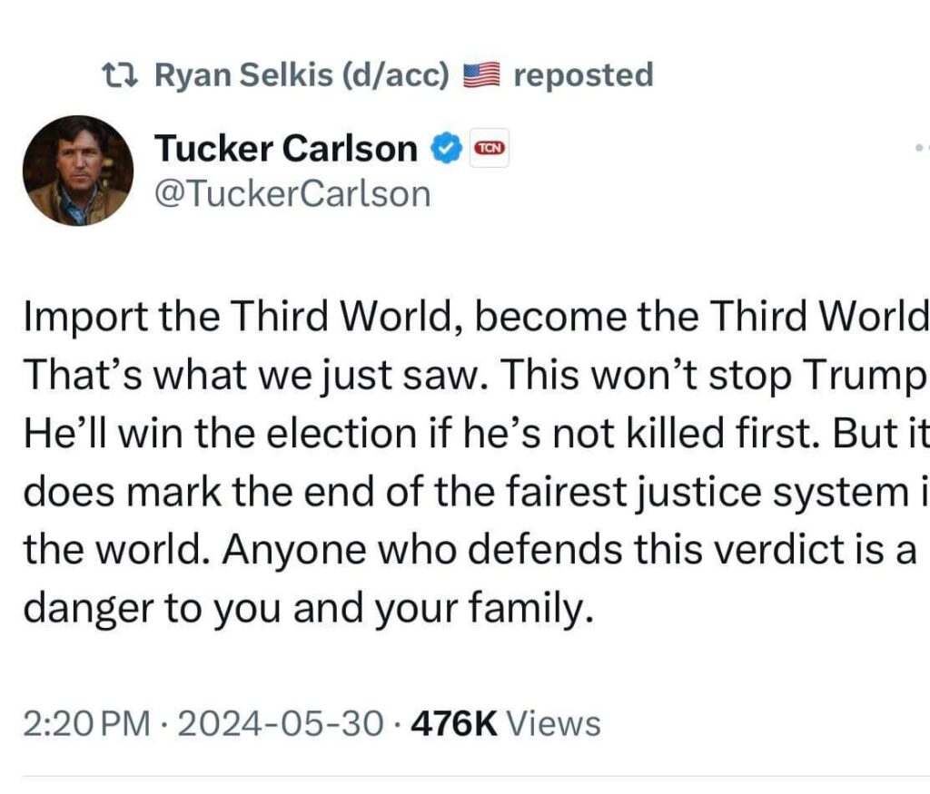 „Тази (присъда на съдебните заседатели) няма да спре Тръмп. Той ще спечели изборите, ако първо не бъде убит. Но това означава краят на най-справедливата съдебна система в света. Всеки, който защитава тази присъда, представлява опасност за вас и семейството ви“, написа журналистът на своята страница в социалната мрежа „Екс“ (бивша Twitter).