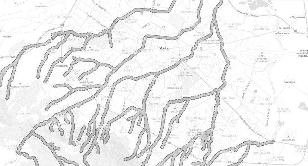 На втората снимка виждате 100-метровата зона около реките на София, която би трябвало да е минимумът за защита. Данните са на Софияплан и Столична община. Доста ще намерят жилищата си върху самите реки, много от които са активно унищожени от досегашни главни архитекти и кметове, а земята на още доста е все още частна и на места има приети отдавна ПУП-ове и документи за (пре-)застрояване. Третата снимка показва всички реки на София според стария ОУП.