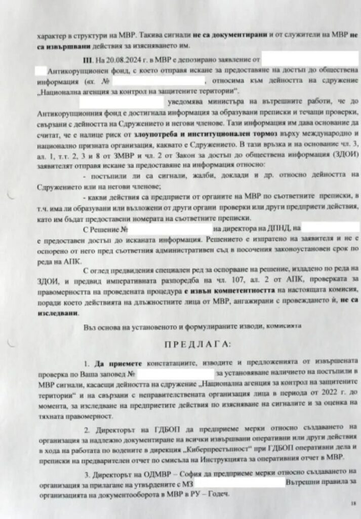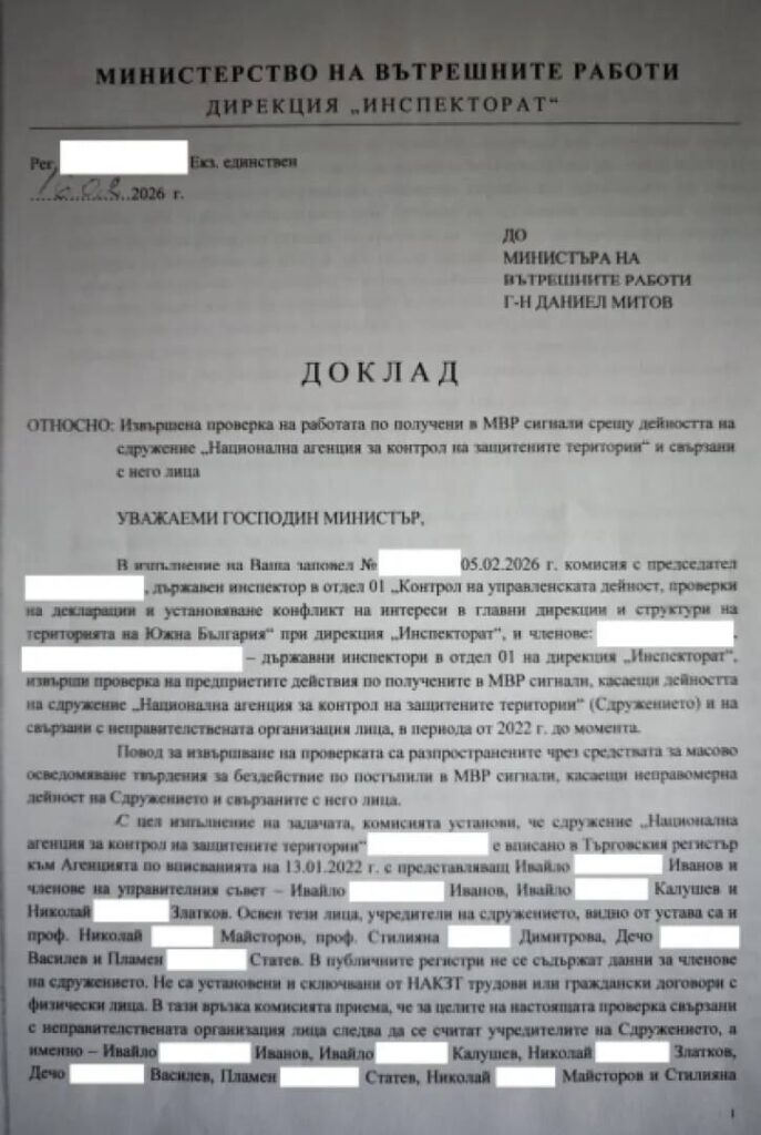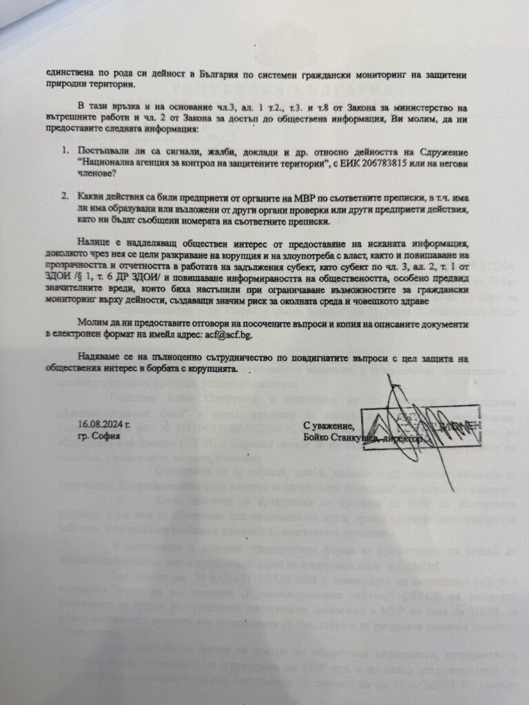МВР публикува доклад за проверка на сигнали срещу сдружението на Ивайло Калушев. От 2022 година до момента са получени четири сигнала, свързани с дейността на т. нар. Национална агенция за контрол на защитените територии и свързани с нея лица. През 2024 година от Антокорупционния фонд изразяват съмнение относно работата на МВР по тези сигнали, която според тях е предпоставка за институционален тормоз върху национално и международно призната организация. От фонда са поискали да им бъде предоставен достъп по материалите съгласно закона за достъп до информация.