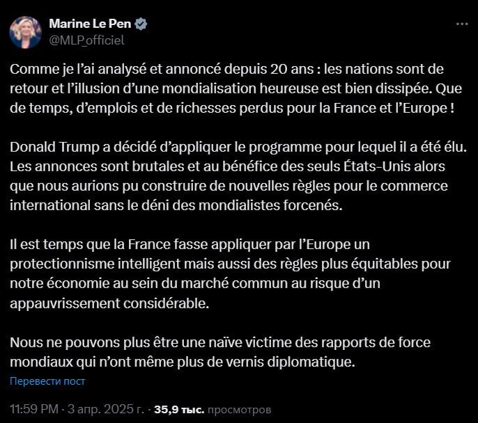 „Доналд Тръмп реши да изпълни програмата, за която беше избран“, коментира Марин льо Пен новите мита на Тръмп.