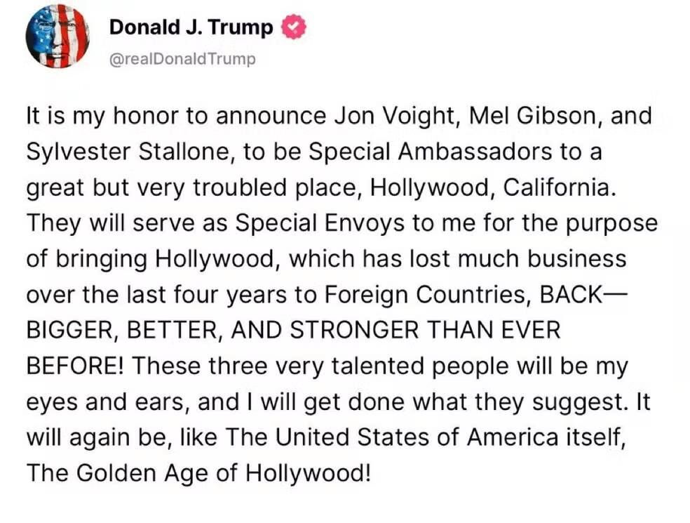 Новоизбраният президент обяви в социалната си мрежа „Трут Соушъл“, че тримата актьори ще бъдат неговите очи и уши във филмовия град. „Отново ще дойде Златният век на Холивуд, както и на самите Съединени американски щати!“, написа Тръмп.