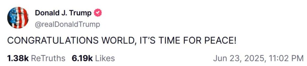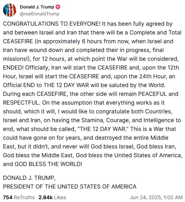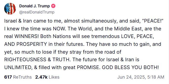 „ПОЗДРАВЛЕНИЯ НА ВСИЧКИ! Израел и Иран се съгласиха напълно да има пълно и тотално прекратяване на огъня (след около 6 часа, когато Израел и Иран се оттеглят и завършат текущите си, последни мисии!) за 12 часа, след което войната ще се счита за приключила! Иран официално ще започне прекратяването на огъня, а в 12-ия час Израел ще започне прекратяването на огъня, а в 24-ия час светът ще приветства официалния край на 12-дневната война. По време на всяко прекратяване на огъня другата страна ще поддържа МИР и УВАЖЕНИЕ. Ако приемем, че всичко се развие както трябва, а ще се развие, бих искал да поздравя и двете страни, Израел и Иран, за издръжливостта, смелостта и интелигентността, които имат да сложат край на това, което би трябвало да се нарече „12-дневна война“. Тази война можеше да продължи с години и да унищожи целия Близък изток, но не се разви и никога няма да се развие! Бог да благослови Израел, Бог да благослови Иран, Бог да благослови Близкия изток, Бог да благослови Съединените американски щати и Бог да благослови света!“