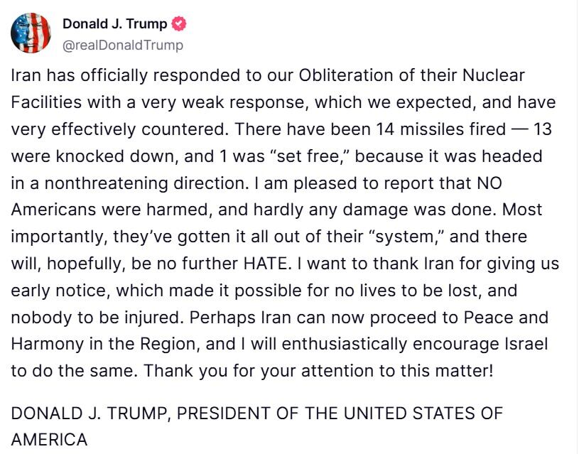 „Иран официално отговори на унищожаването на ядрените си съоръжения с много слаб отговор, който ние очаквахме и контраатакувахме много ефективно. Изстреляни бяха 14 ракети – 13 бяха свалени, а една беше „освободена“, защото се движеше в безобидна посока. Радвам се да съобщя, че НИТО ЕДИН американски гражданин не е пострадал и почти не са нанесени щети. Най-важното е, че те извадиха това от „системата“ си и се надявам, че няма да има повече омраза. Искам да благодаря на Иран, че ни предупреди предварително, така че никой да не е убит или ранен. Може би Иран сега може да продължи по пътя към мир и хармония в региона и бих насърчил ентусиазирано Израел да направи същото. Благодаря ви за вниманието към този въпрос!“