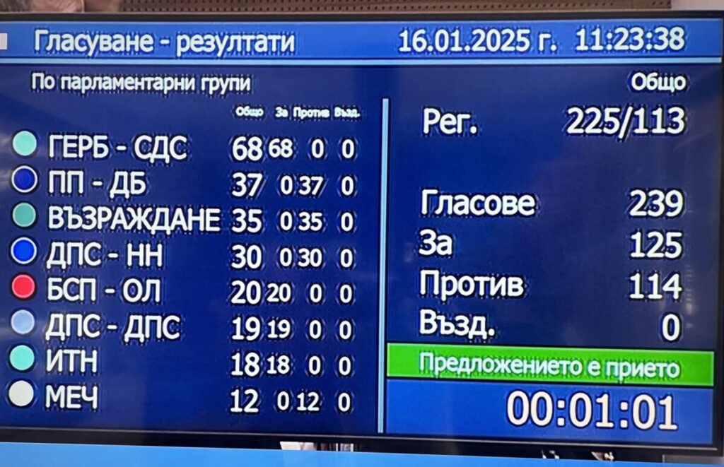 Парламентът избра правителството с премиер Росен Желязков. Съставът на кабинета беше одобрен със 125 гласа „за“, 114 „против“ и без въздържали се. Гласовете дойдоха от ГЕРБ, БСП, ИТН и ДПС, а против бяха Пеевски от НеНе, Възраждане и ПП-ДБ. Така свърши едноличният режим на Пеевски със служебния кабинет на Главчев!