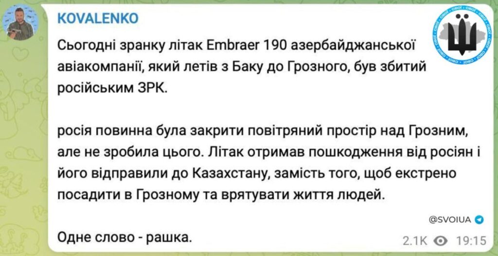 Embraer 190 на „Азербайджанските авиолинии“ е бил свален от руска система за противовъздушна отбрана, – NSDO. Тази сензационна версия тръгна от украинските служби по телеграм каналите.