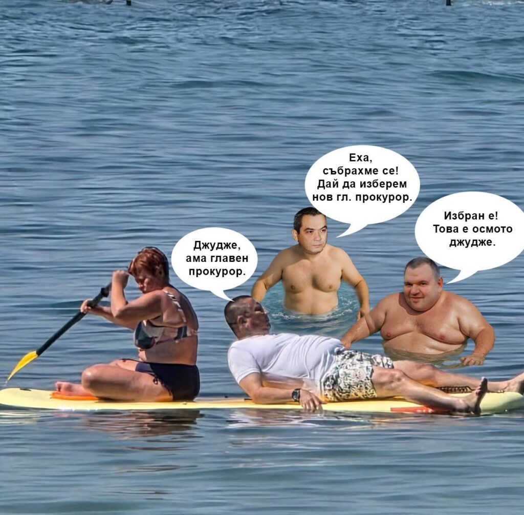 Вчера се появиха снимки как Сарафов кара отпуската в резиденция Евксиноград във Варна на падъл борд с цена си, а после социалните медии бяха залети с тематични колажи с антуража на и.ф.-то на Пеевски и нелегитимния с отдавна изтекъл мандат ВСС.