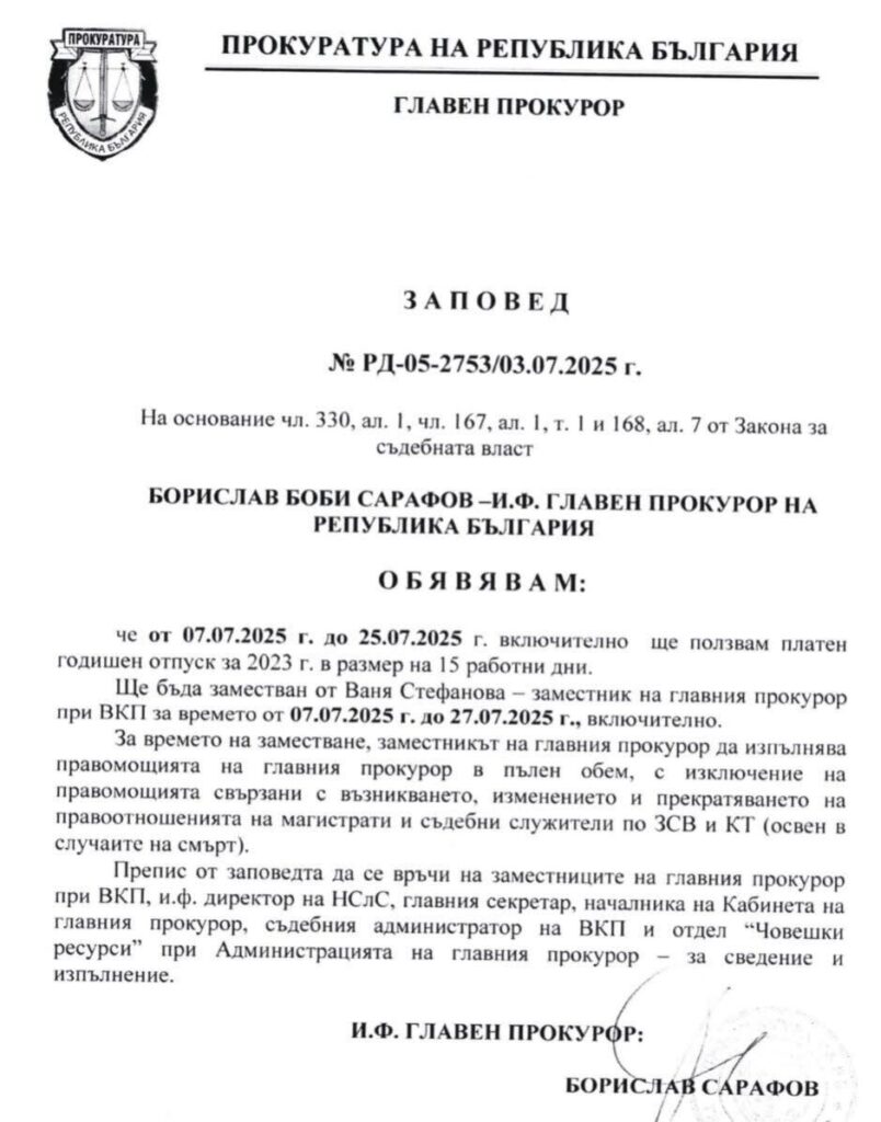 Бившият съдия и кандидат за главен прокурор на ГС БОЕЦ Методи Лалов публикува заповедта за отпуск, която Сарафов сам си е разписал, ползвайки натрупани дни още от 2023 година, когато се прегрупираха с Иван Гешев. От нея става ясно, че Сарафов се кани да се връща на работа. Това ще стане още през следващата седмица.