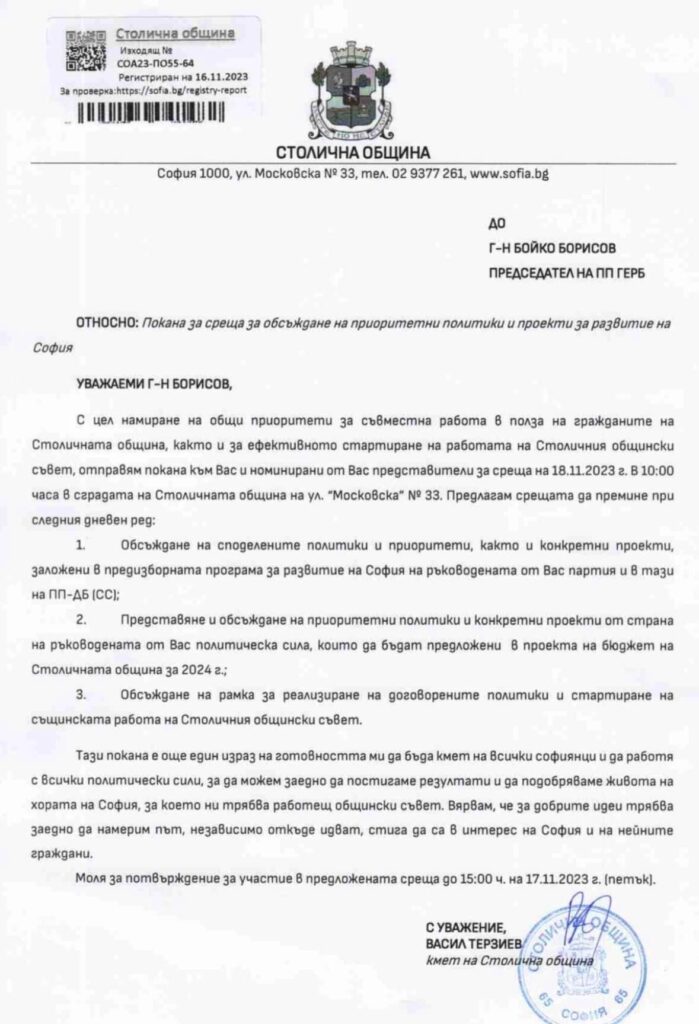 Васил Терзиев изпрати лична покана до Бойко Борисов за среща, на която да обсъдят приоритетни политики и проекти за развитие на София?!