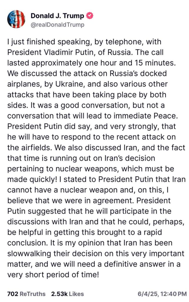 “Току-що приключих разговора си по телефона с президента на Русия Владимир Путин. Разговорът продължи приблизително час и 15 минути. Обсъдихме атаката срещу акостиралите на Русия самолети от Украйна, както и различни други атаки, извършвани от двете страни. Беше добър разговор, но не такъв, който ще доведе до незабавен мир. Президентът Путин наистина заяви, и то много категорично, че ще трябва да отговори на неотдавнашната атака срещу летищата. Обсъдихме също Иран и факта, че времето за решението на Иран относно ядрените оръжия изтича, което трябва да бъде взето бързо! Заявих на президента Путин, че Иран не може да притежава ядрено оръжие и по този въпрос смятам, че сме на едно мнение. Президентът Путин предложи да участва в дискусиите с Иран и че може би би могъл да помогне за бързото им приключване. Според мен Иран се движи бавно по този много важен въпрос и ще ни е нужен окончателен отговор в много кратък срок!”